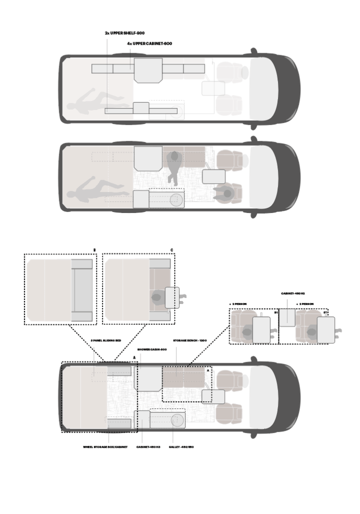 Our interior system outperforms the status quo by being super lightweight, has exceptional insulating properties and is fully compatible with the factory dimensions of Mercedes-Benz. The highest material standard is applied for maximum durability, which includes powder coating aluminium, ABS, hydrofoob closed-cell foam and automotive standard fabrics.