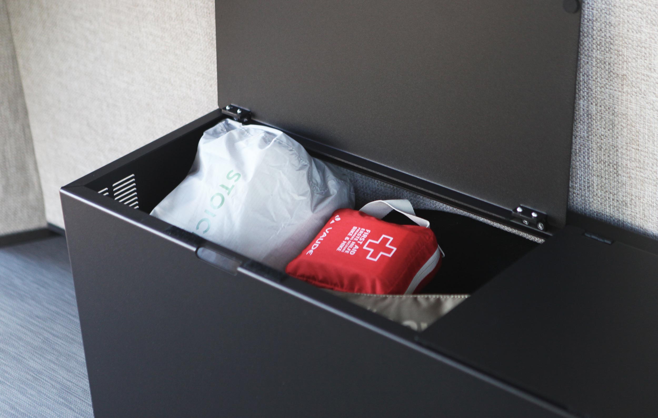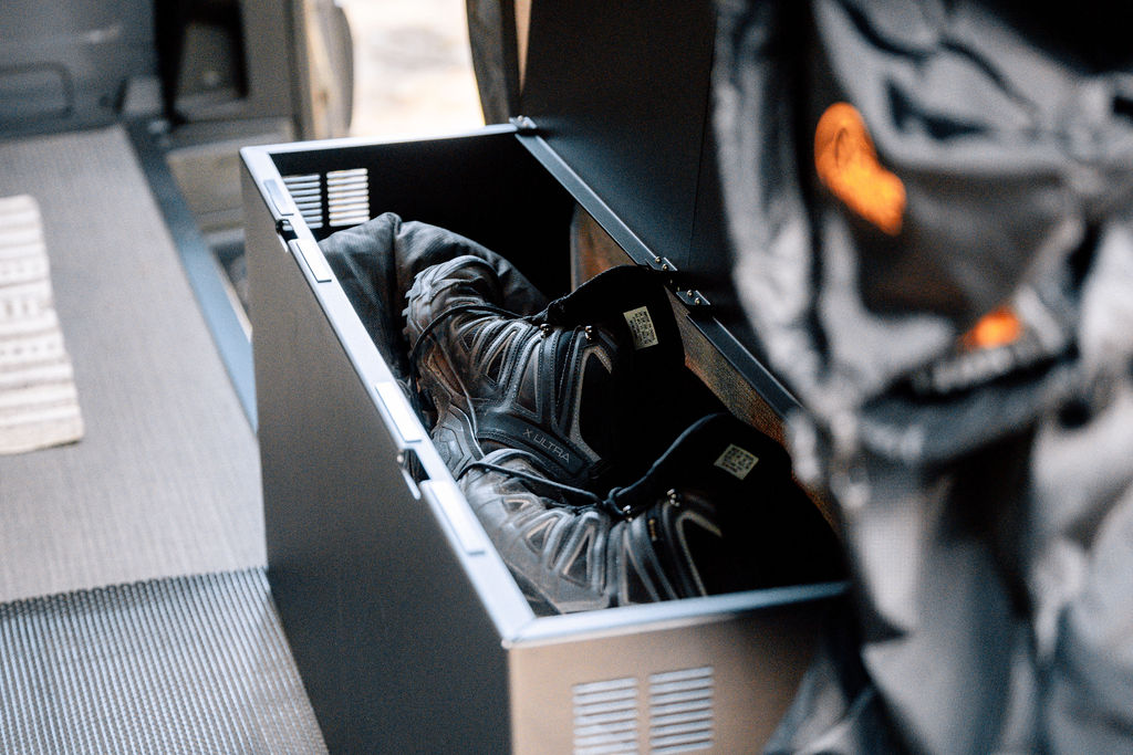 This box can be placed over each wheel well and can be accessed on the inside by opening one of the top lids. It creates useful extra storage space and gives room for small electrical installations. The powder coated aluminium gives a solid protection against water, dirt and salt and keeps your stuff dry. Can be placed on both driver and passenger side.